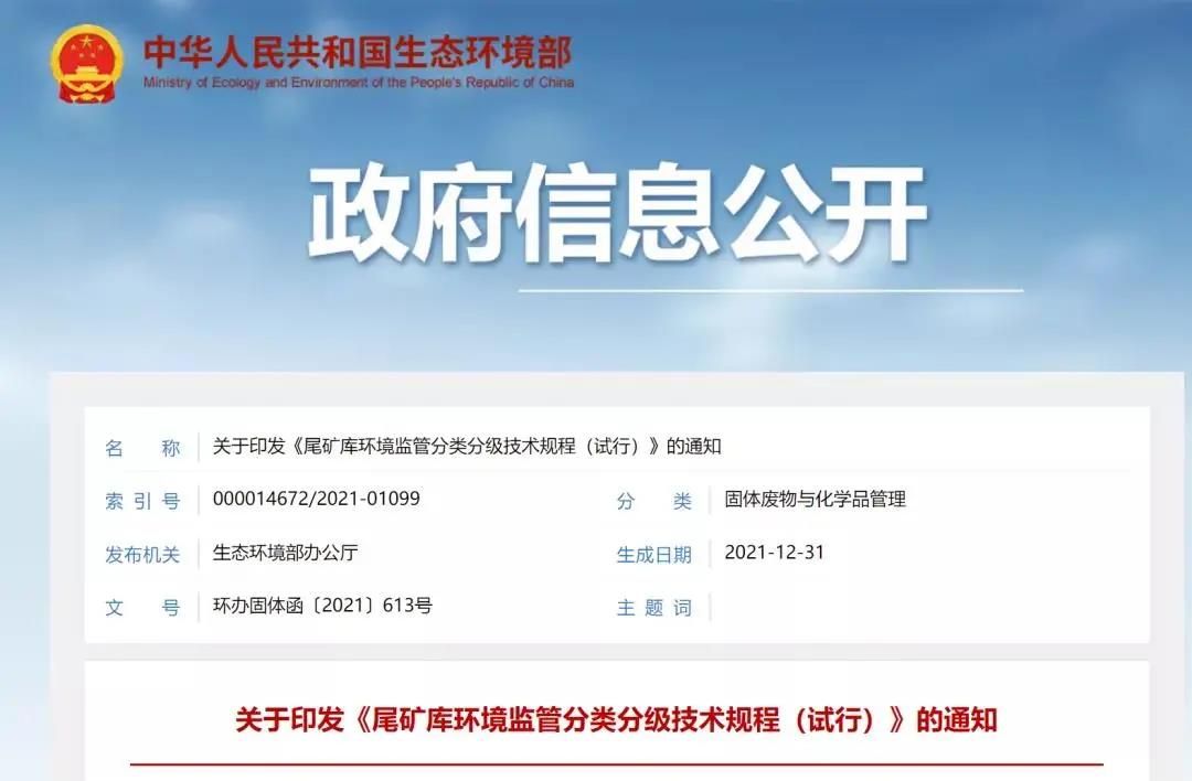 近日,生態(tài)環(huán)保部網(wǎng)站公布關(guān)于引發(fā)《尾款庫環(huán)境保護(hù)分類分級技術(shù)規(guī)程(試行)》的通知。根據(jù)通知《尾款庫環(huán)境保護(hù)分類分級技術(shù)規(guī)程(試行)》,該技術(shù)規(guī)程于2021年12月31日生成。這是尾款庫監(jiān)督管理方面極其重要的一項(xiàng)新的技術(shù)規(guī)程。